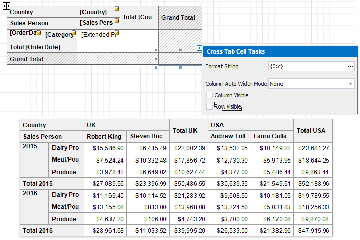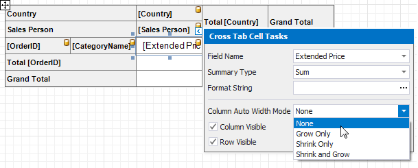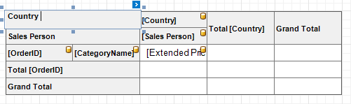 Use a cell’s Row Visible and Column Visible properties to specify row and column visibility. For instance, select the bottom right cell and disable these options to hide grand totals. At design time, invisible cells are filled with a hatch brush.