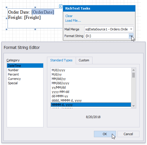 The mail merge feature enables you to apply formats to embedded field values. Select a required data field and click the control’s smart tag. Click the Format String property’s ellipsis button, and in the invoked Format String Editor, choose a built-in format pattern.