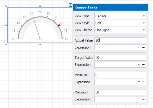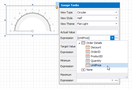To bind the gauge’s displayed value to data, click the control’s smart tag and in the invoked actions list, expand the Expression drop-down list for the Actual Value property and select the required data field.