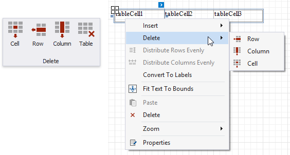 Use the Delete group in the toolbar‘s Table Tools contextual tab or the Delete context menu items to remove table elements.