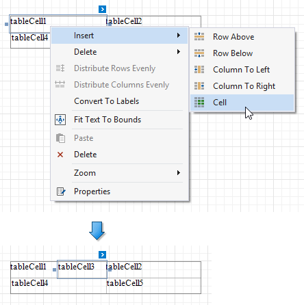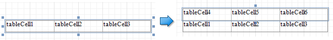 Inserts a row below the current cell and shifts the existing rows down. This command increases the band height to accommodate all the rows if there is not enough space under the table.