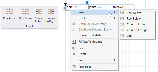 You can use the Insert group in the toolbar‘s Table Tools contextual tab or the Insert context menu items to add new rows and columns. The added cells inherit the source cells’ size and appearance settings.