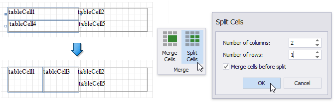 Invokes the Split Cells dialog where you can specify the number of columns and rows to split the selected cells. You can apply this change to each selected cell individually, or merge the cells and then split the resulting cell.