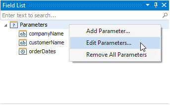 Right-click the Parameters node in the Field List and select Edit Parameters.