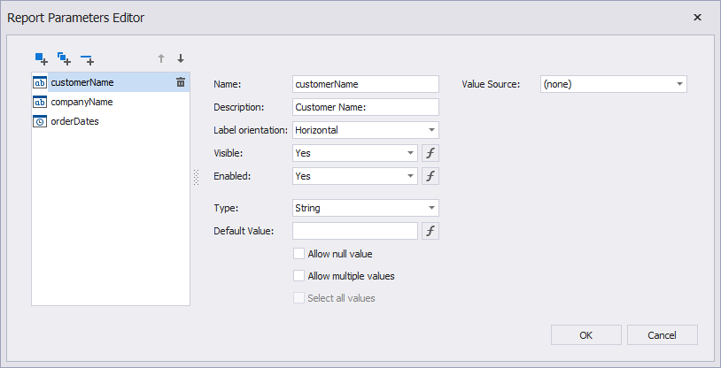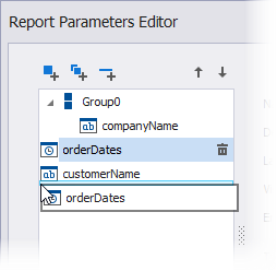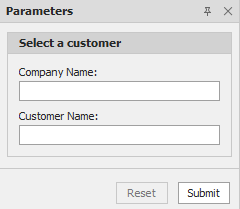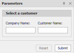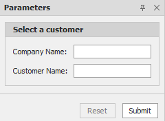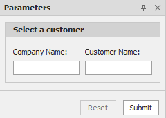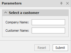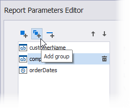 To customize a group, select it and use its editors on the right to set up the group appearance. The following example unites the customerName and companyName parameters into a group called Select a customer.