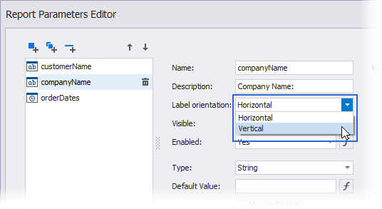 Specify the Label orientation property to choose the position of a parameter label relative to an editor.