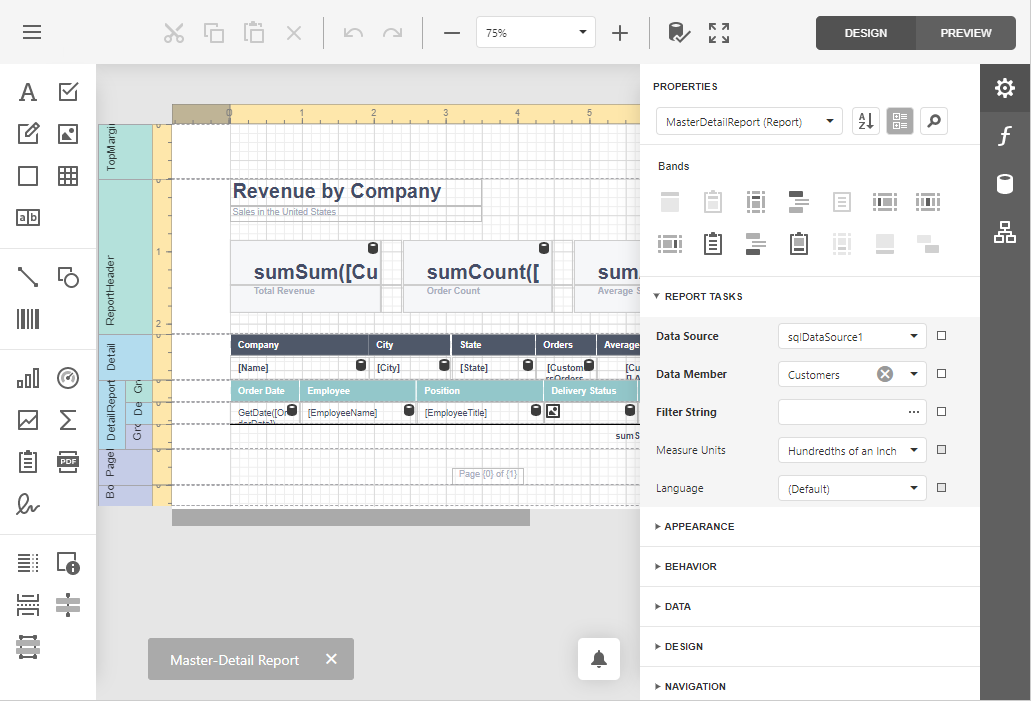The Web Report Designer allows you to create data-bound reports and contains a rich set of tools to construct report layouts that meet your requirements.
