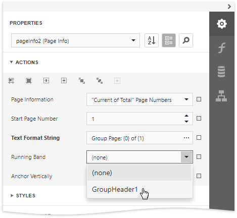 To change the control’s display format, specify the Text Format String property (e.g., Page {0} of {1}, to display the current page number out of the total number of pages) in the Page Info Tasks category.