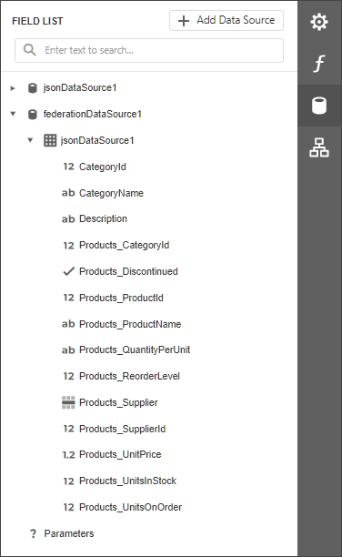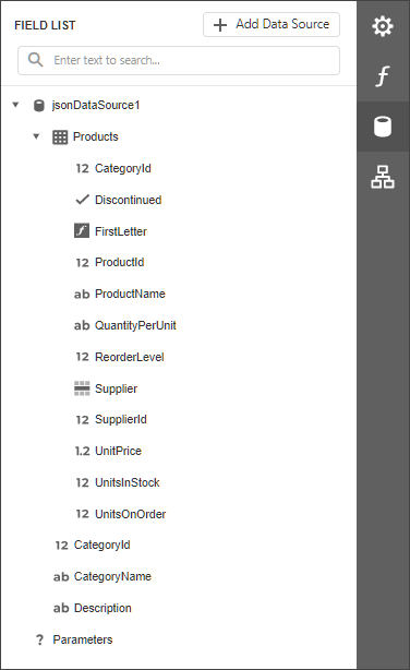 [ { "CategoryId": 1, "CategoryName": "Beverages", "Description": "Soft drinks, coffees, teas, beers, and ales", "Products": [ { "ProductId": 1, "ProductName": "Chai", "SupplierId": 1, "CategoryId": 1, "QuantityPerUnit": "10 boxes x 20 bags", "UnitPrice": 18.0000, "UnitsInStock": 39, "UnitsOnOrder": 0, "ReorderLevel": 10, "Discontinued": false, "Supplier": null }, { "ProductId": 2, "ProductName": "Chang", "SupplierId": 1, "CategoryId": 1, "QuantityPerUnit": "24 - 12 oz bottles", "UnitPrice": 19.0000, "UnitsInStock": 17, "UnitsOnOrder": 40, "ReorderLevel": 25, "Discontinued": false, "Supplier": null } ] }, { "CategoryId": 2, "CategoryName": "Condiments", "Description": "Sweet and savory sauces, relishes, spreads, and seasonings", "Products": [ { "ProductId": 3, "ProductName": "Aniseed Syrup", "SupplierId": 1, "CategoryId": 2, "QuantityPerUnit": "12 - 550 ml bottles", "UnitPrice": 10.0000, "UnitsInStock": 13, "UnitsOnOrder": 70, "ReorderLevel": 25, "Discontinued": false, "Supplier": null }, { "ProductId": 4, "ProductName": "Chef Anton's Cajun Seasoning", "SupplierId": 2, "CategoryId": 2, "QuantityPerUnit": "48 - 6 oz jars", "UnitPrice": 22.0000, "UnitsInStock": 53, "UnitsOnOrder": 0, "ReorderLevel": 0, "Discontinued": false, "Supplier": null } ] } ]The created JSON data source is displayed in the Field List pane: