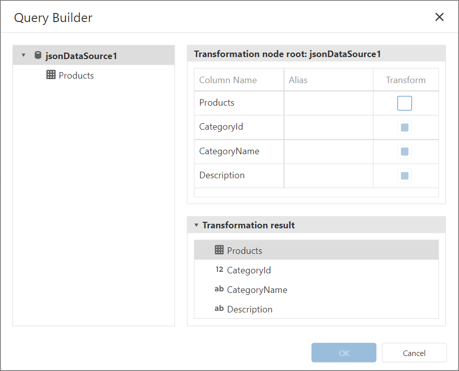 The invoked Query Builder displays the columns that you can transform.