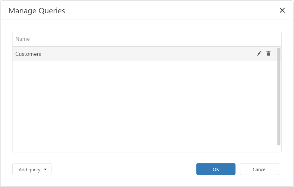When you create a federated query, its name is set to the name of the first table added to the query. You can rename the query in the Manage Queries dialog. To invoke the dialog, click the Manage Queries button.