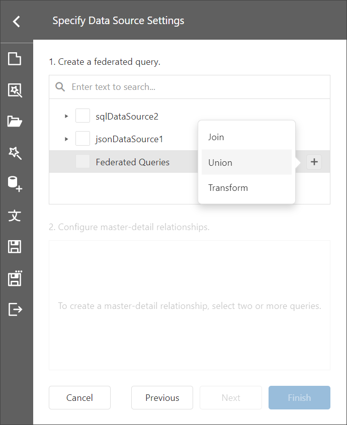 On the next page, click the + (plus) button and select Union to add a Union query.