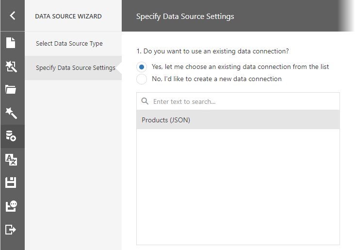 If you prefer to create a new data connection, specify its settings. You can use a Web Service Endpoint, a filename, or a string with JSON data. In this example, the JSON data is obtained from a JSON sample data location.