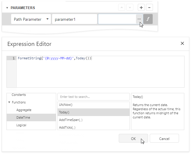 Expressions can include report parameters. In the Expression Editor, expand Parameters, select a report parameter to which you want to bind the path parameter, query parameter, or header parameter, and click OK.