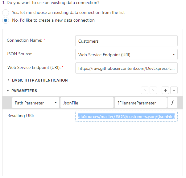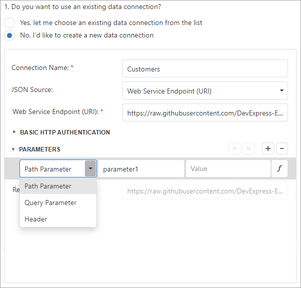 The Data Source Wizard sends a request to the endpoint with the specified parameters to populate the data source and build the data source schema. Ensure that the parameters are always set to the values that the endpoint expects. Otherwise, the Data Source Wizard generates an error on the next steps.