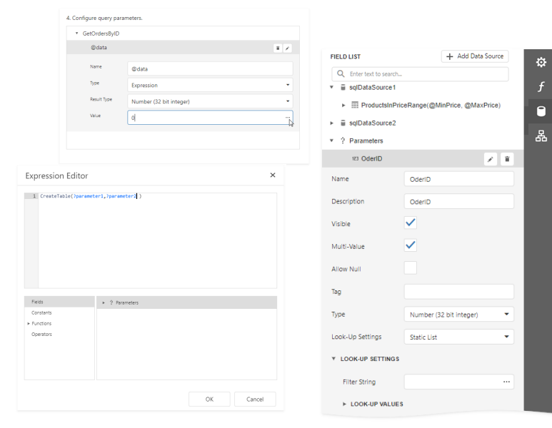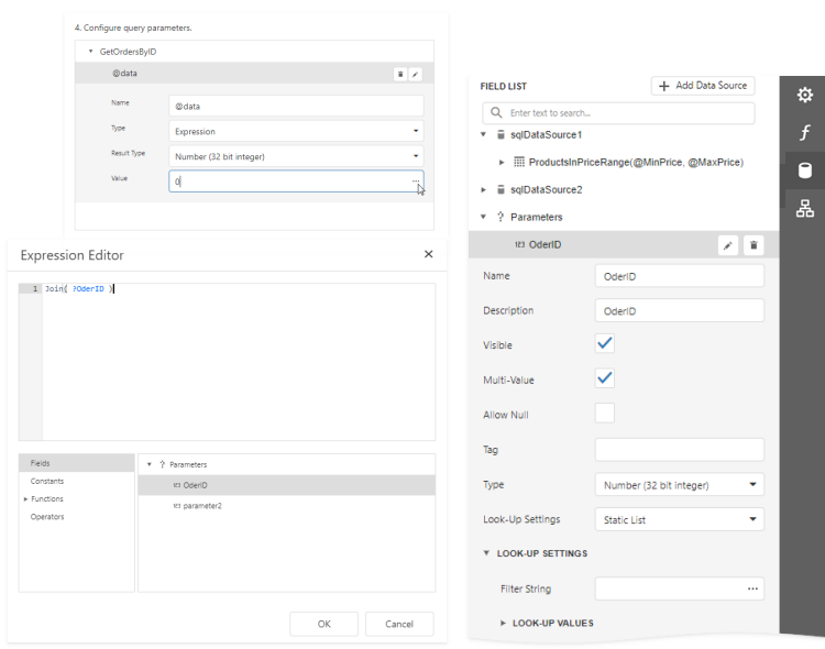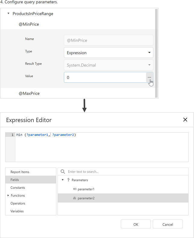 Click the Value property’s ellipsis button and construct an expression in the invoked Expression Editor. You can map a report parameter that already exists in a report to a query parameter.