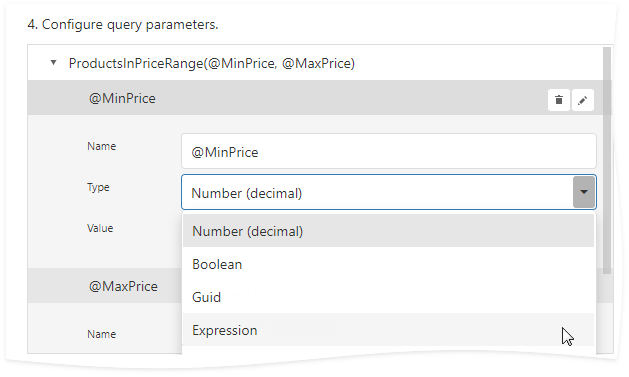 Choose a query parameter’s value type and set a static value to the Value property according to the selected type.