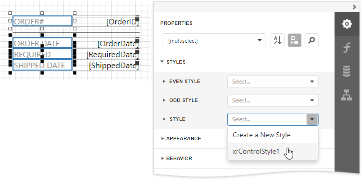 Select report elements, expand the Styles category and choose a style in the Style property’s drop-down list to apply the style to the selected elements.