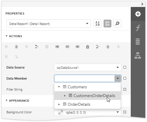 Select the Detail Report band and select the master-detail relationship’s name in the Data Member property’s drop-down list.