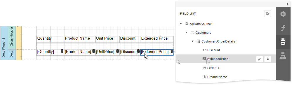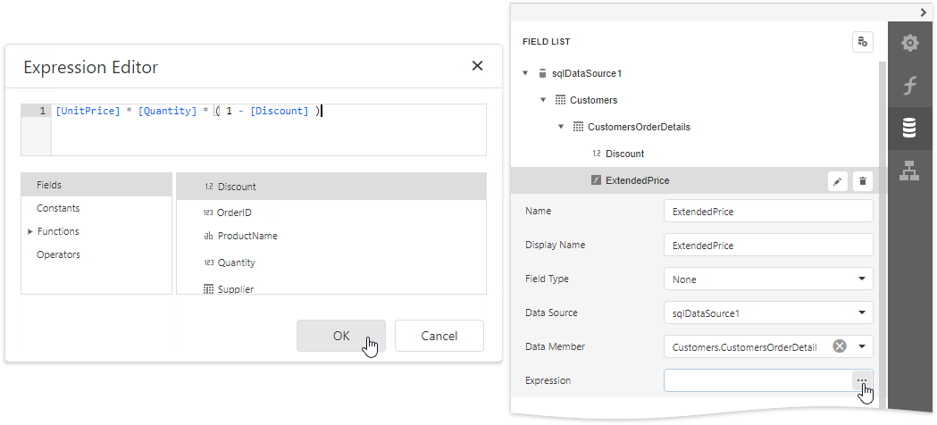 Click the Edit button for the calculated field and change its name to ExtendedPrice. Click the Expression property’s ellipsis button, and in the invoked Expression Editor, construct the expression based on the UnitPrice, Quantity and Discount fields.