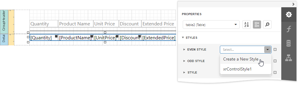 You can provide different appearances to alternating (odd and even) table rows in the detail report. Select the table and expand the Styles property in the Property Grid. Invoke the drop-down list for the EvenStyle property and select New.