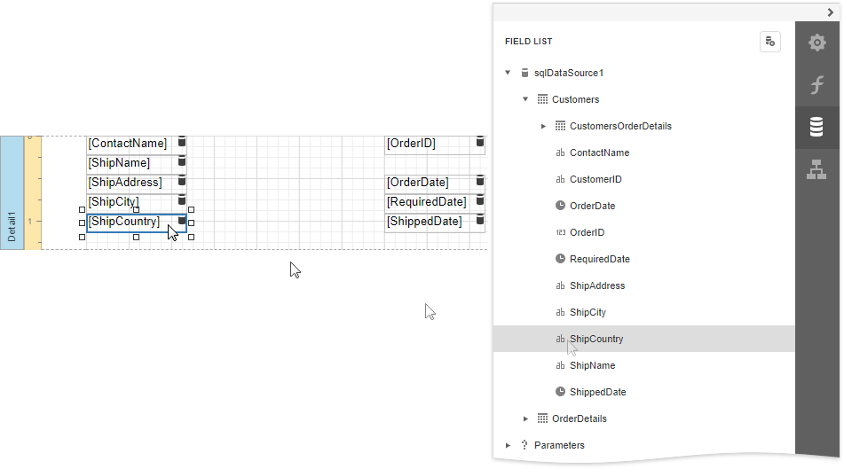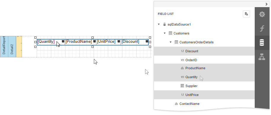 Add dynamic content to the detail report. Go to the Field List, select the data fields while holding down CTRL or SHIFT and drag-and-drop them onto the Detail band. This automatically creates a Table control with table cells bound to the corresponding fields.
