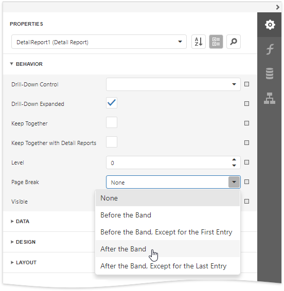 Select the Detail Report band, expand the Behavior category and set the band’s Page Break property to After the Band to print each order on a separate page.