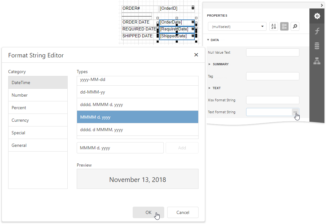 In the master report’s Detail band, select controls bound to date fields while holding down CTRL. Switch to the Properties panel, expand the Data category and click the Text Format String property’s ellipsis button. In the invoked Format String Editor, activate the DateTime category and select the format, for example, display dates as a month (name) followed by the day (number) and year (four digits).