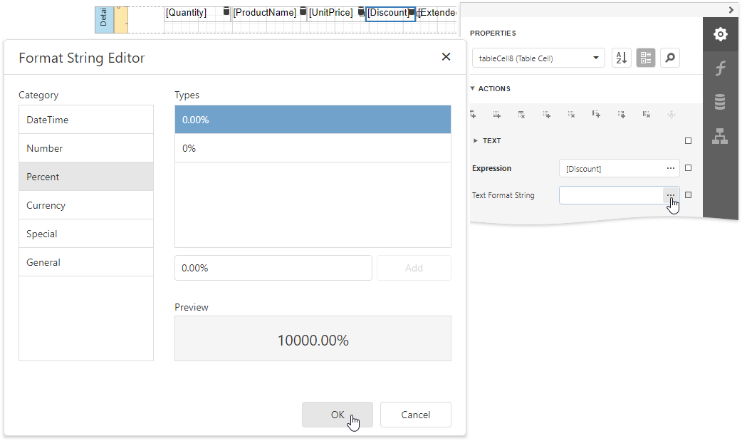 Select the table cell bound to the Discount data field in the detail report’s Detail band. Expand the Cell Tasks category, click the Text Format String property’s ellipsis button, and in the invoked Format String Editor, apply the Percent format. In this case, field values are multiplied by 100 and displayed with a percent symbol.