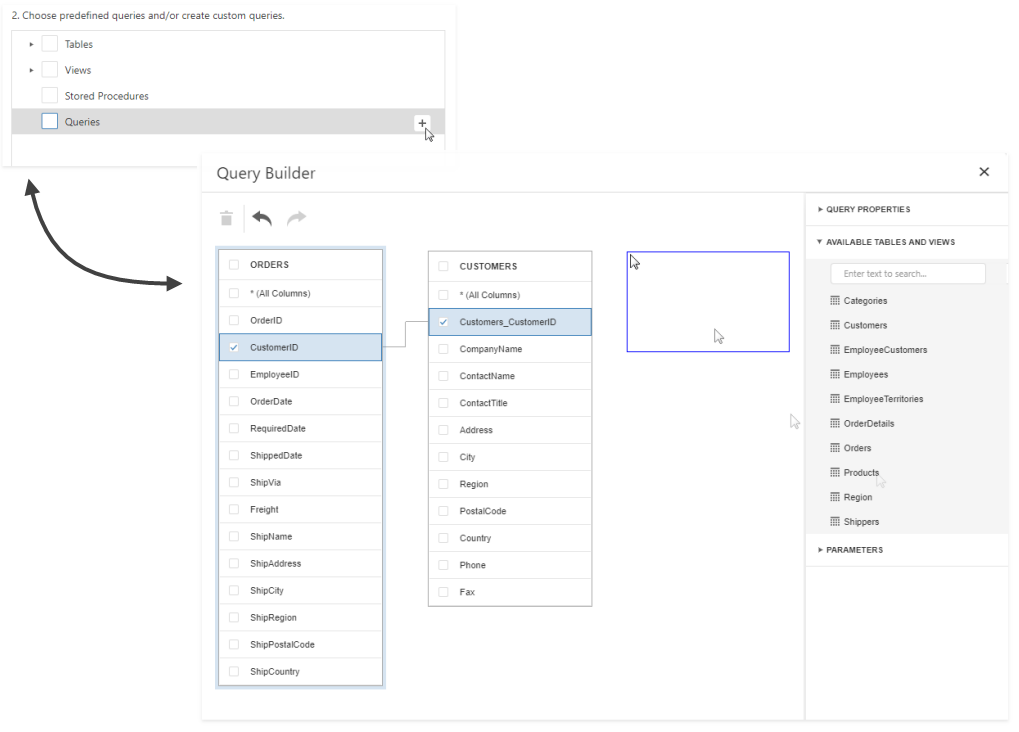 Obtain data from two different tables to display information about customers and orders at the same hierarchical level in the report. Click the plus button for the Queries category to create a custom query. In the invoked Query Builder, add the required data tables to a query and join them based on a key column.