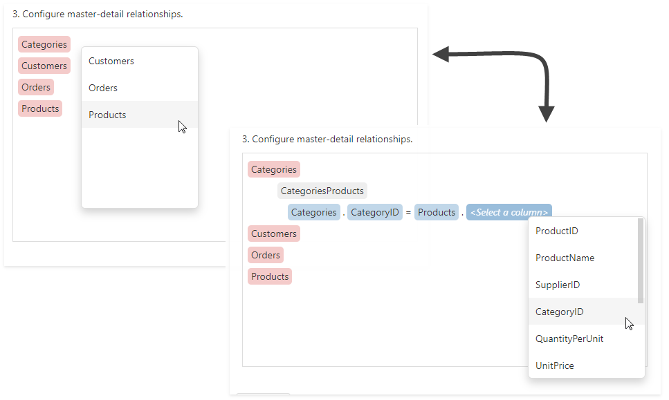 On the same page, specify a master-detail relationship between the queries. Select the required key fields (columns) to connect tables.