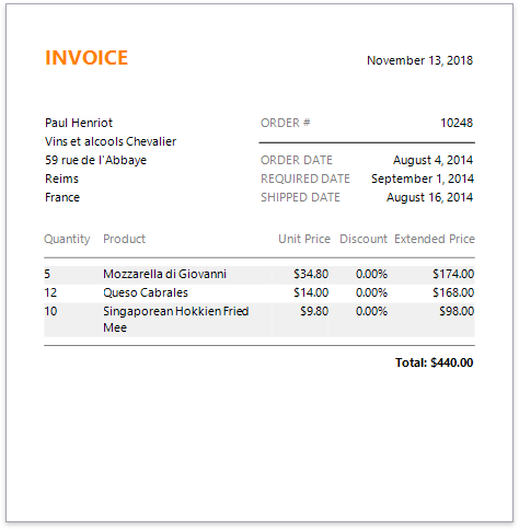 This tutorial describes how to create a simple invoice report displaying information about customers and their orders. You can perform similar steps to create various invoice layouts depending on your requirements.