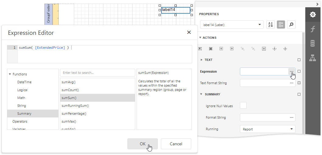 Drop the Label control onto the added band and expand the Label Tasks category in the Properties panel. Select the Summary section and set the Running property to Report to calculate the summary for the entire detail report and click the Expression property’s ellipsis button. In the invoked Expression Editor, specify the following expression to calculate the total price: