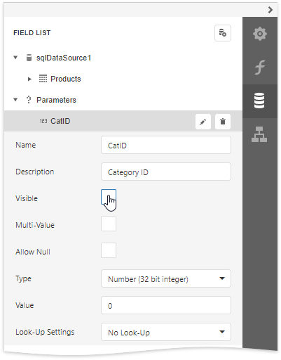 Click the Edit button for the created parameter and specify the parameter’s Name and Type as well as disable the Visible property.