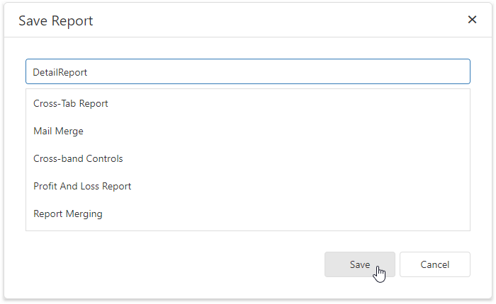 Click Save | Save As in the designer menu to save the detail report to the server-side report storage. In the invoked standard Save dialog, specify the folder and file name.