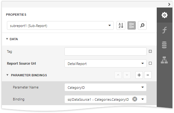 Bind the subreport’s parameter used as a filter criterion to the master report’s corresponding data field, which serve as a source of the parameter value. To do this, expand the Data category, select the Parameter Bindings section and add a new parameter binding. In the binding properties list, specify the data field to which you want to bind a subreport parameter and the name of the parameter that you want to bind.