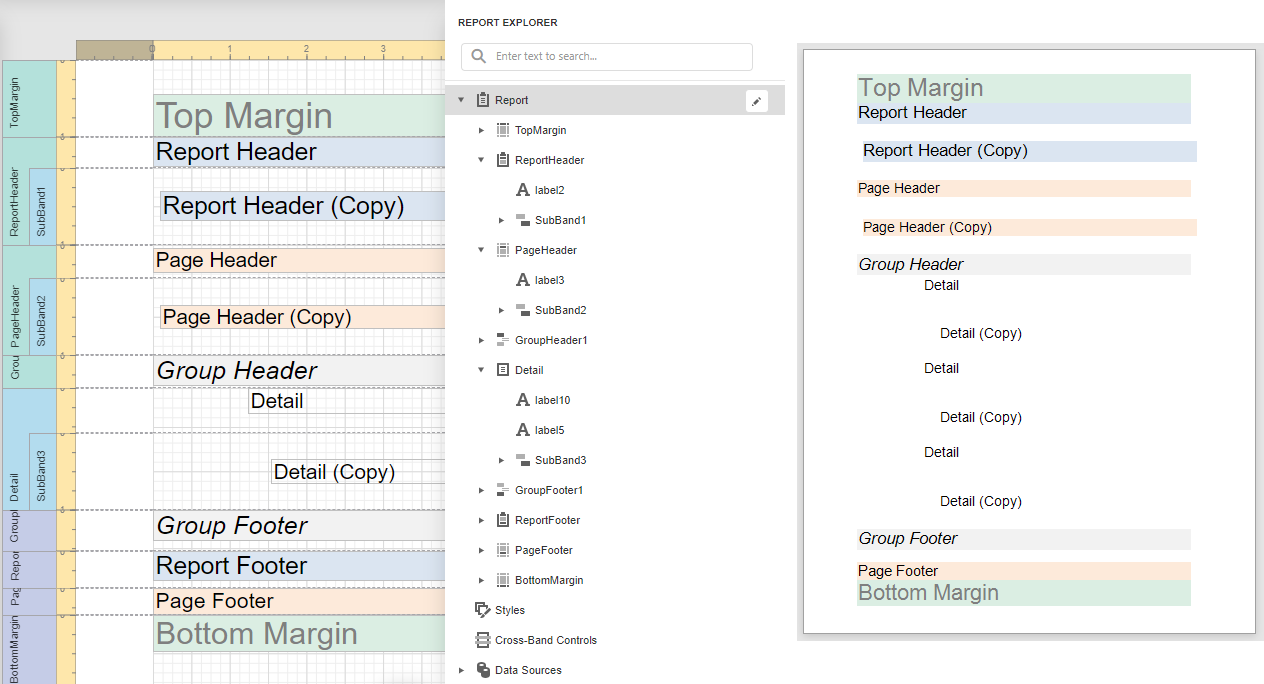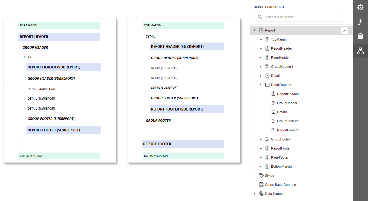 Use the detail report band to create hierarchical master-detail reports. Detail report bands provide detailed information about each record in the master report’s detail band. You can create such reports when master-detail relationships are defined between data source tables: