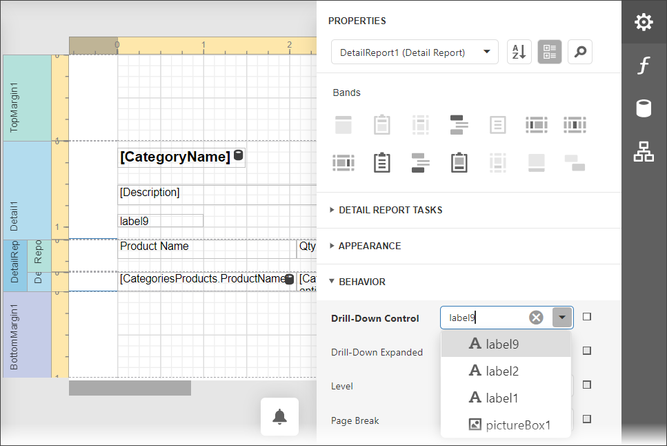 Select the detail report band, open the Behavior category and expand the drop-down menu for the band’s Drill-Down Control property in the Properties panel.