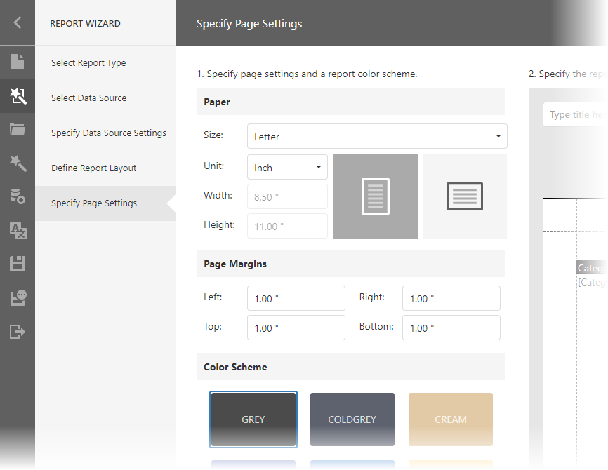 Choose between Inch, Millimeter and Pixel to specify size options at this step. After you finish the wizard, the Report Designer transforms the specified units to HundredthsOfAnInch, TenthsOfAMillimeter or Pixels.Width and Height