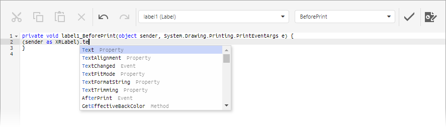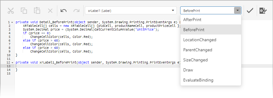 located on the End-User Report Designer’s Main Toolbar. In the displayed Script Editor, specify the report control and its event by the toolbar. The toolbar contains all scripts written for all report elements, and allows you to quickly navigate through them by choosing the required report element in the corresponding drop-down list and specifying one of its available events in another menu.