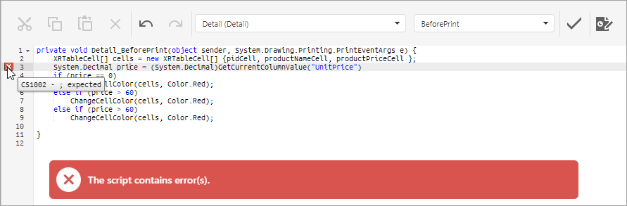 The Script Editor allows you to write code for specific event handlers in the End-User Report Designer to adjust the behavior of report controls, bands, or a report itself. This topic describes the basic principles of using scripts, the Script Editor interface and shows how scripting can be used in a report.