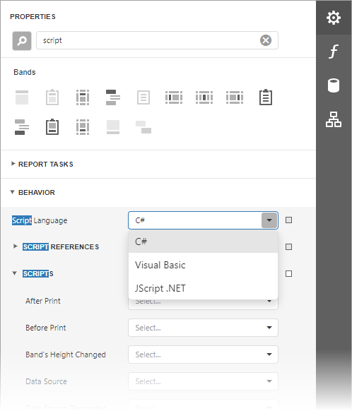 The Script Editor supports C#, Visual Basic .NET and JScript .NET scripting languages. This means that the scripting language is independent from the language used to create the report. The language is specified by the Script Language property. The selected scripting language must be the same for all scripts used in a report.