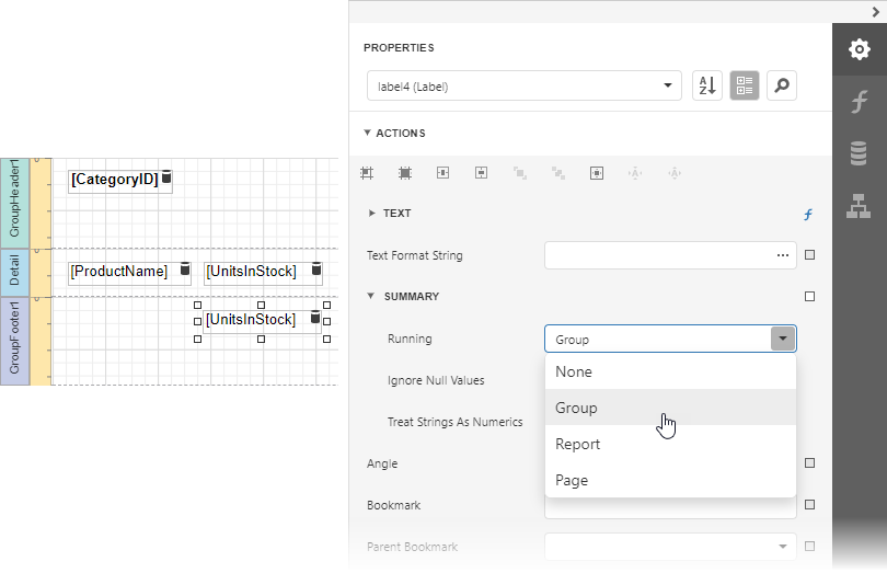 Select the label, expand the Summary section and invoke the Running drop-down list. Select the range for which to calculate a summary (the entire report, a specific report group or document page).