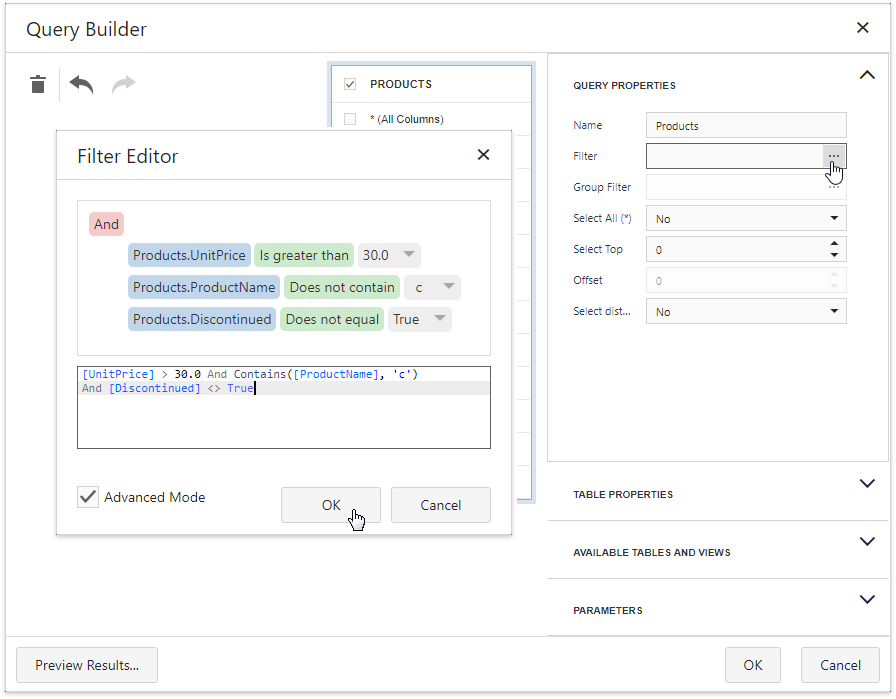 Expand the Query Properties section in the invoked Query Builder. Click the ellipsis button for the Filter property to construct a filtering expression in the invoked Filter Editor.