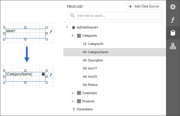 After you bind your report to data, the Field List panel displays the data source hierarchy and provides access to available data fields.