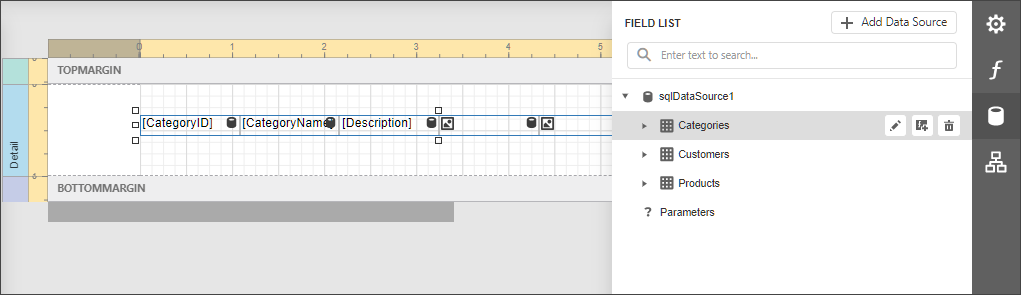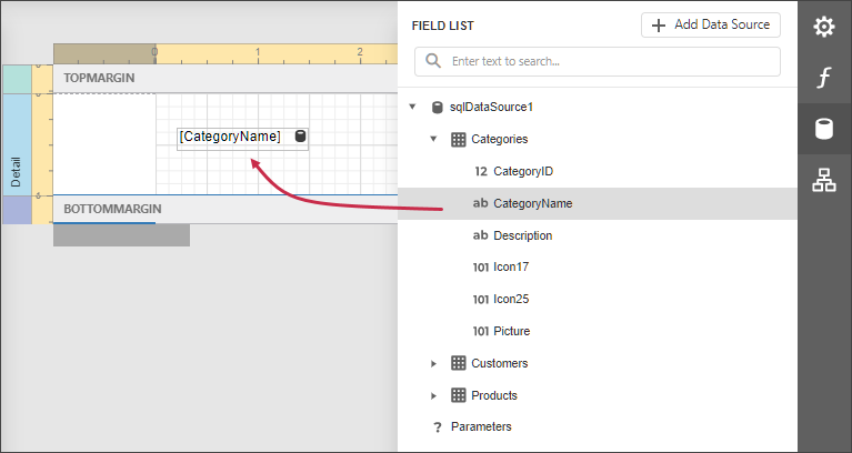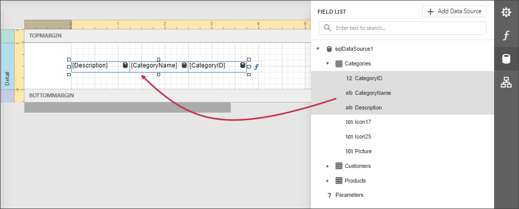 Drop a data field from this panel onto a report’s surface to create a new report control bound to the corresponding field.