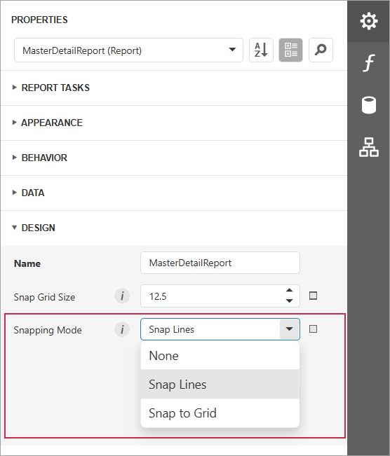 Use the report’s Snapping Mode property to enable automatic report control snapping to a grid or snap lines: