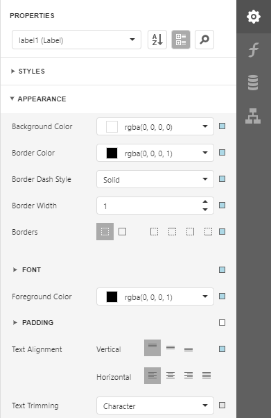 The smart tag contains properties from the element’s Task group of the Properties Panel. Note that complex properties (for example, Symbology for a Barcode control) need to be configured in the Properties Panel.