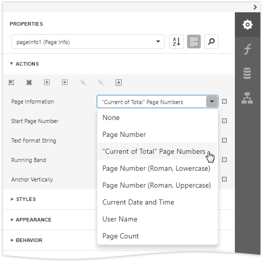 To add a new Page Info control to a report, drag the Page Info item from the Toolbox and drop it onto the required report band.
