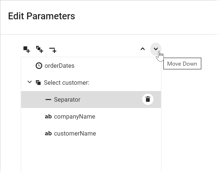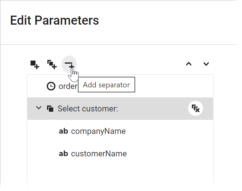The example below shows the Parameters panel with a separator between the Company Name and Customer Name parameters.